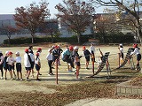 体育では、持久走です。制限時間内にどれだけ走れるか挑戦しています。前回の記録より伸びるようにがんばっています。