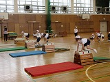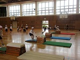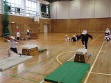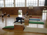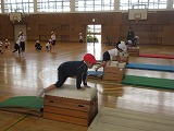 体育では、跳び箱です。開脚跳びが上手です。準備片付けも全員で協力して行っています。