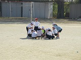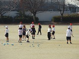 体育では、チームで玉入れの球を相手陣地に運んでいます。作戦会議が大事です。うまくいったでしょうか。